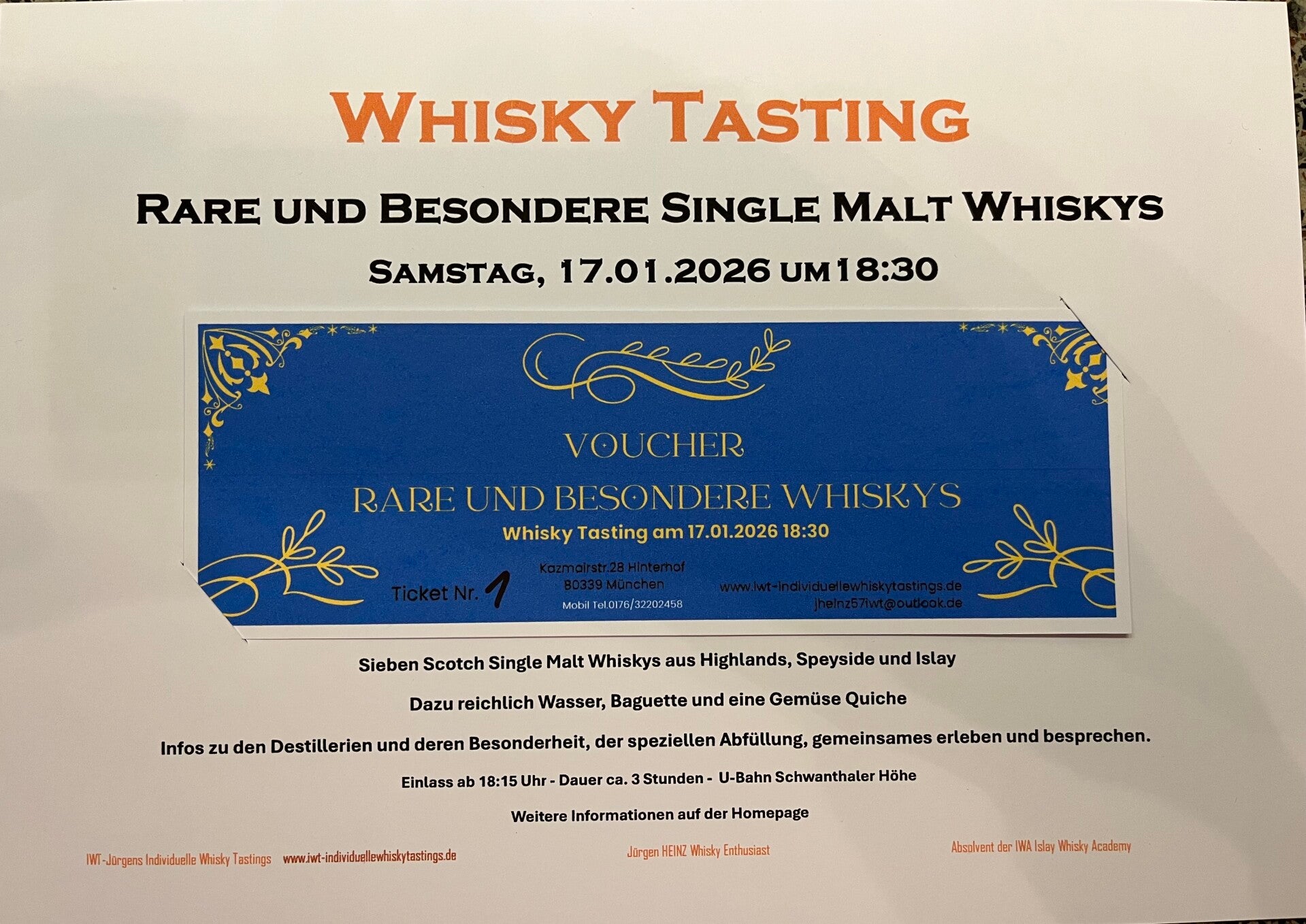 Tauchen Sie ein in die Welt des Whisky und erleben Sie Einsteiger Tastings, Whisky Tastings, individuelle Tastings etc., die ganz auf Ihre Vorlieben zugeschnitten sind. Bei mir stehen Genuss und Qualität im Mittelpunkt. Entdecken Sie Aromen und Geschmackserlebnisse, die Sie begeistern werden.